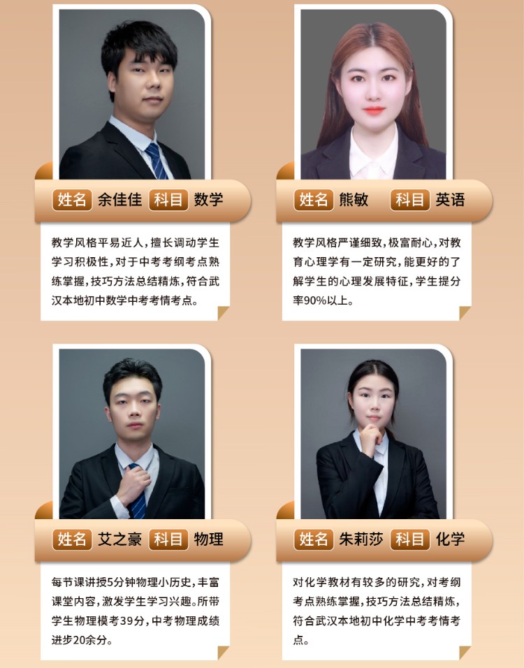 教师团队各老师均为科班出身,对武汉中高考有着深入的研究,能精准抓住中高考考点,针对薄弱知识点由浅入深的讲解,帮助考生形成自己的知识体系,让考生学会举一反三,应对知识点的各种演变题型。
